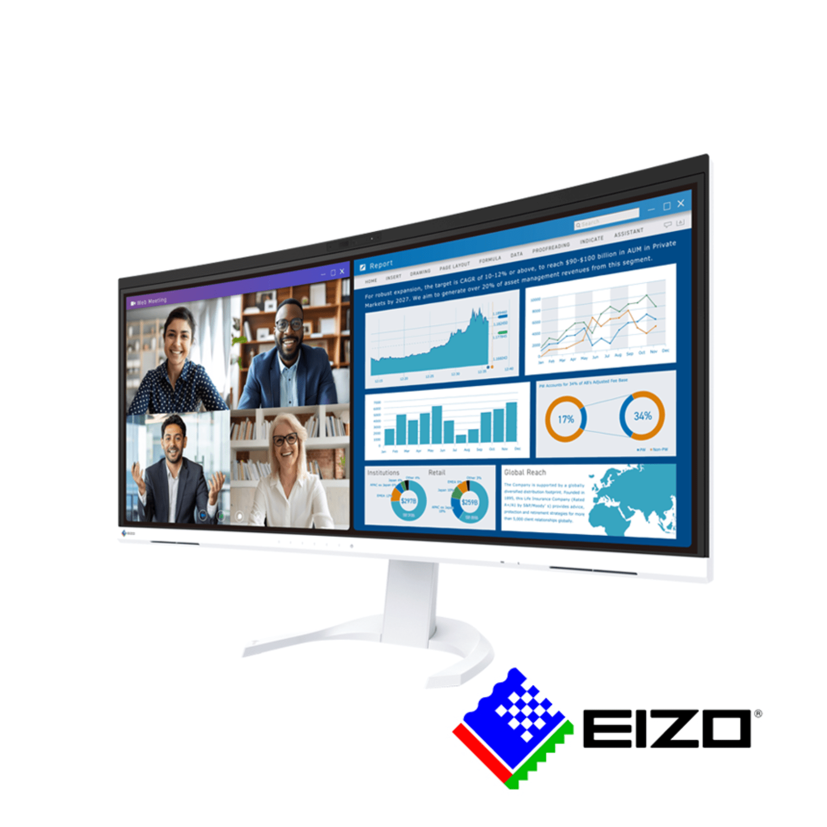 The 34.1-inch EV3450XC is EIZO’s first monitor with a built-in webcam and microphone. Combined with USB Type-C docking and LAN capabilities, this ultrawide UWQHD (3440 x 1440) curved monitor offers streamlined viewing and communication for the modern business professional.